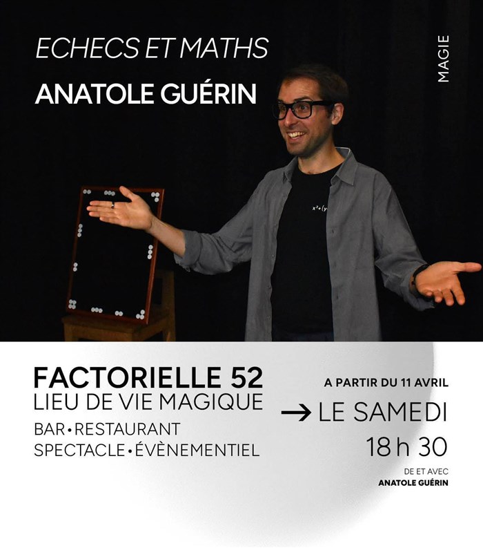 Découvre Anatole Guérin dans Echecs et maths, qui fait partie de notre sélection d’événements de type Magie et prestidigitation et qui se tient ici : Factorielle 52 -