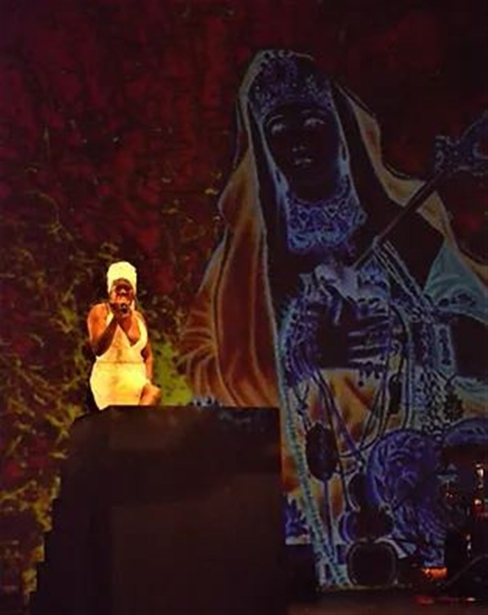 Il propose de montrer comment l'effigie de la vierge Marie est utilisée comme subterfuge pour prier et interpeller les divinités. Intention 4 Echos des Divinité'es met en lumière les Dieux-femmes, interroge l'association de divinités non chrétiennes aux saints catholiques – certaines divinités étant assimilées à la sainte vierge Marie.