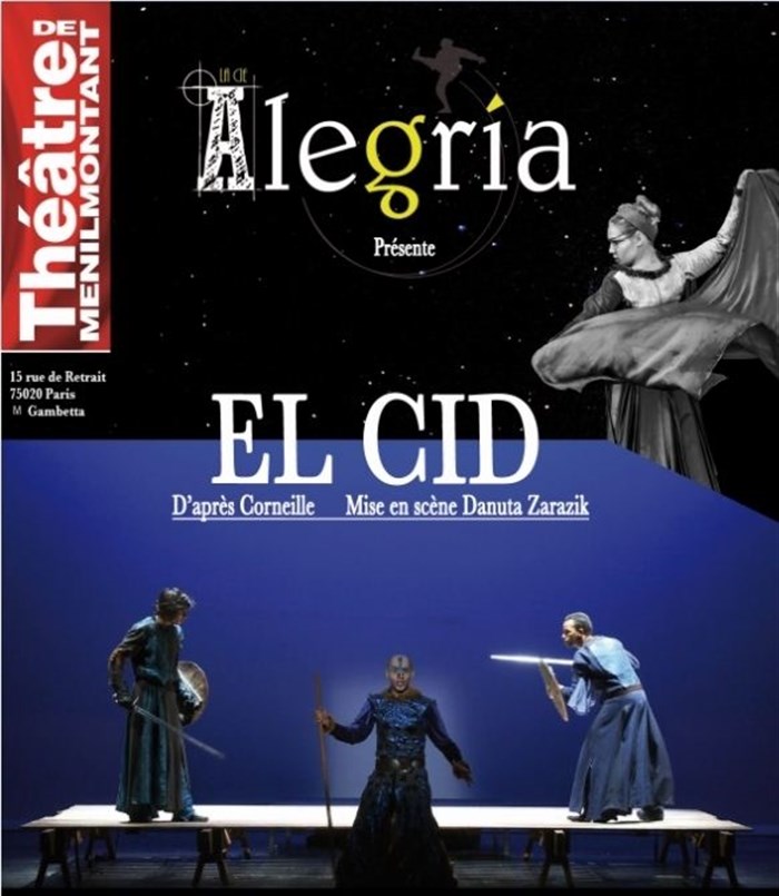 Spectacle à la fois vivant, humain et esthétique. Les vers de Corneille sont respectés,énoncés avec naturel par les comédiens, et mis en valeur par une excellente diction et des respirations qui en soulignent le sens et la beauté. La mise en scène inventive déploie des combats à l'épée, des danses évoquant des figures de flamenco et des chants extrêmement harmonieux, ornementant la pièce sans jamais la dénaturer. Le personnage du roi introduit un côté comique, fin, original et très drôle. Chimène et Rodrigue vivent devant nous, passionnément, leur amour contrarié; Don Diègue se révolte contre les vicissitudes de la vieillesse, avec une rage et un désespoir qui nous prennent aux tripes; l'infante lutte avec douleur contre ses sentiments pour Rodrigue et le père de Chimène crache brillamment son orgueil, avant de mourir. Tous sont entourés de servantes, page et gentilshommes très à l'aise dans leurs rôles. Nous avons emmené deux de nos petites filles voir cette représentation; l'une d'elle est âgée de quatre ans. Nous lui avions expliqué l'histoire exposée par la pièce; elle a assisté au spectacle, sans "décrocher", du début à la fin. Nous lui glissions, de temps à autre, un complément discret d'information. La seconde, âgée de 11 ans, a déjà apprécié "Arlequin..." et "Le malade..." joués par la même Compagnie; elle aussi a particulièrement aimé "El Cid". Tout cela pour exprimer que les aspects visuels sont réellement captivants. "El Cid" mérite qu'on se dérange de très loin pour le voir. Bravo à la Compagnie Alegria!