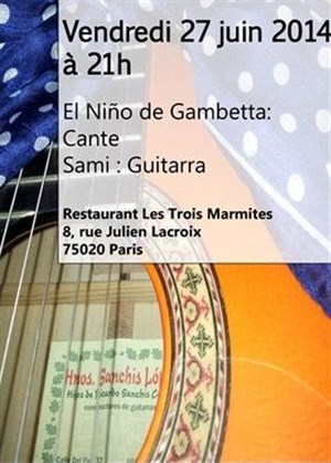 El Niño de Gambetta et sa bande vous propose une plongée dans l'univers du flamenco, dans une ambiance de fiesta locale typique . Venez découvrir la Peña Flamenca itinérante de Paris et voyager en Andalousie le temps d'une soirée.