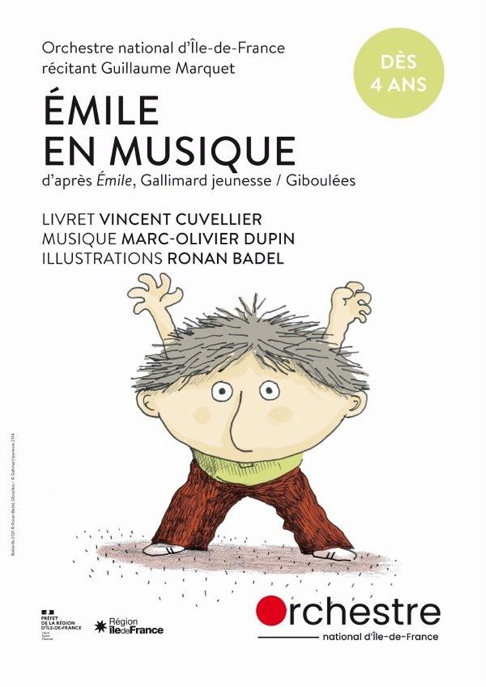 Chic, l'Orchestre National d'Ile de France a concocté un concert qui s'adresse (d'abord) aux enfants ! Charmé par l'irrésistible espièglerie des albums jeunesse de Vincent Cuvellier, le compositeur Marc-Olivier Dupin met en musique l'histoire du petit Emile, un enfant à qui il arrive de multiples aventures. Le conte musical s'inspire de toutes les histoires qu'a déjà connues Émile dans ses livres : Émile est invisible, Émile se déguise, Émile a froid... Et l'on découvre combien Émile n'est pas têtu : il est très, très, très têtu. Il est aussi malin, farceur, rêveur.