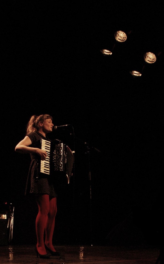 Emilie considère le théâtre et la chanson indissociables et se pose en interprète au sens double du mot.
