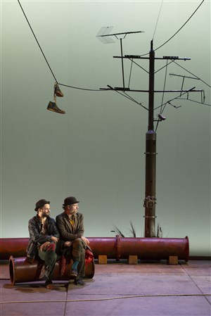 Deux vagabonds, Vladimir et Estragon, se retrouvent dans un endroit indéfinissable à la tombée de la nuit pour attendre un certain Godot.