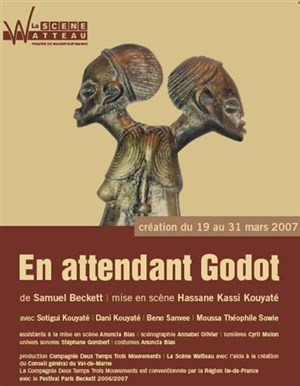 Hassane Kassi Kouyaté souligne que " les protagonistes de la pièce ne sont pas des personnages psychologiques, ni des individualités au sens classique du terme, ce sont des ombres, des figures et surtout ce sont des voix... Vladimir et Estragon ne représentent-ils pas tous ces gens qui attendent que les politiques, les financiers, Dieu ou les dieux viennent changer leur vie ?'' Pour la première fois Hassane Kassi Kouyaté met en scène son père, l'immense acteur Sotigui Kouyaté. Héritier d'une famille de griots du Burkina Faso, il a joué de nombreuses années dans la troupe de Peter Brook et participé à certains de ses plus mémorables spectacles : Le Mahabharata, La Tempête de William Shakespeare...Sotigui Kouyaté interprète le rôle d'Estragon, il est entouré de trois autres comédiens africains. La création d'En attendant Godot est présentée dans le cadre du Festival Paris-Beckett 2006/2007 qui célèbre le centième anniversaire de la naissance de l'auteur.