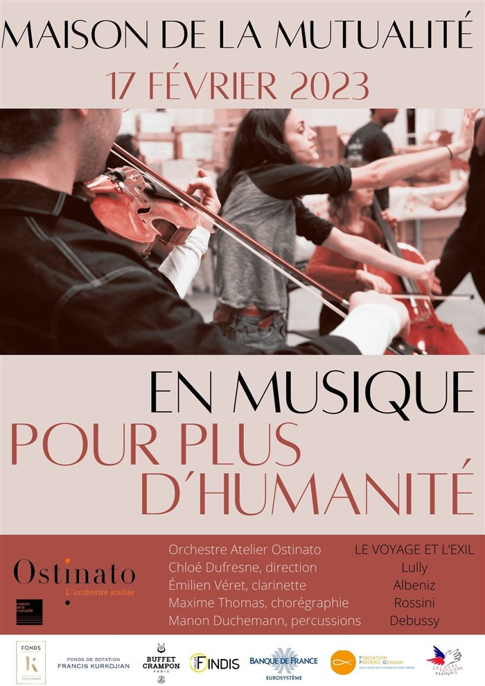 Le 17 février à la Mutualité, La cheffe d'orchestre Chloé Dufresne dirigera la 2ème édition du projet "En musique pour plus d'humanité" de l'Orchestre Atelier Ostinato, Emilien Véret clarinette soliste, les détenus de la prison de Melun aux percussions, ainsi que les personnes accueillies par le Secours Populaire et le JRS, chorégraphiées par Maxime Thomas danseur à l'Opéra de Paris pour un magnifique projet symphonique, percussions et danse autour de l'humain.