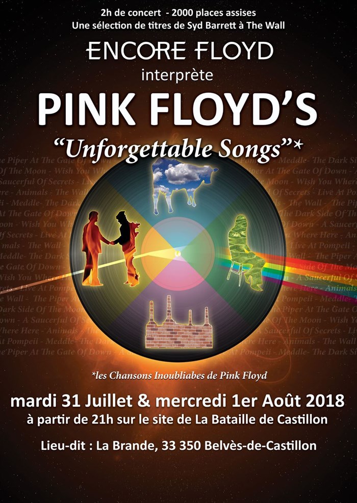 Encore Floyd interprète les titres des Pink Floyd, parmi les plus marquants de la période allant de Syd Barrett (1967) à The Wall (1979). Deux heures de voyage dans une ambiance inspirée du fameux concert à Pompéi sur le site de La Bataille de Castillon.