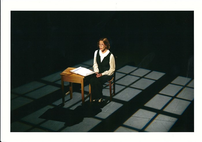 Martine Pascal seule en scène La lumière vient sur le plateau, un bureau d'enfant, un tabouret, une chaise, un livre, une voix s'élève ...