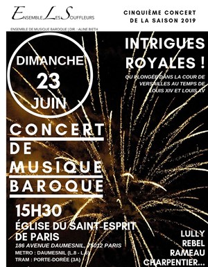 Au programme, des oeuvres de Lully, Philidor, Rebel, Rameau... L'Ensemble Les Souffleurs est heureux de vous présenter son cinquième programme 2019 : " Intrigues Royales ! ou plongée dans la cour de Versailles au temps de Louis XIV et Louis XV ". Sous l'égide de l'association " L'Assemblée Des Souffleurs ", l'Ensemble Les Souffleurs, à grand effectif, cherche par tous ses concerts à faire découvrir au grand public le répertoire de la musique ancienne et ses instruments dits " anciens. " Il réunit des élèves ou anciens élèves venus du CNSMD de Lyon, du CNSMD de Paris, de la Schola Cantorum de Bâle ou encore de l'HEM de Genève.