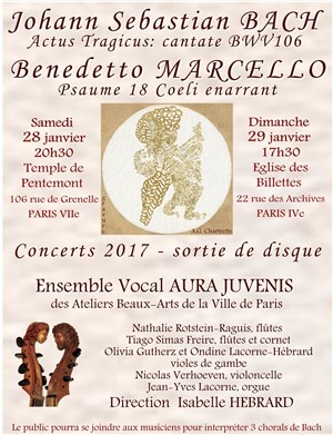 Isabelle Hébrard : direction. Concert donné à l'occasion de la sortie du CD consacré à la cantate Actus Tragicus de Johann Sebastian Bach, une extraordinaire oeuvre du jeune compositeur écrite vers 1707 , et au psaume 18 Coeli Enarrant de Benedetto Marcello extrait de son oeuvre maîtresse "L'Estro Poetico-Armonico" publiée en 1725 à Venise. Ensemble vocal Aura Juvenis Nathalie Rotstein-Raguis : flûtes Tiago Simas Freire : flûtes et cornet. Olivia Gutherz et Ondine Lacorne-Hébrard : violes de gambe. Nicolas Verhoven : violoncelle. Jean-Yves Lacorne : orgue. Isabelle Hébrard : direction.