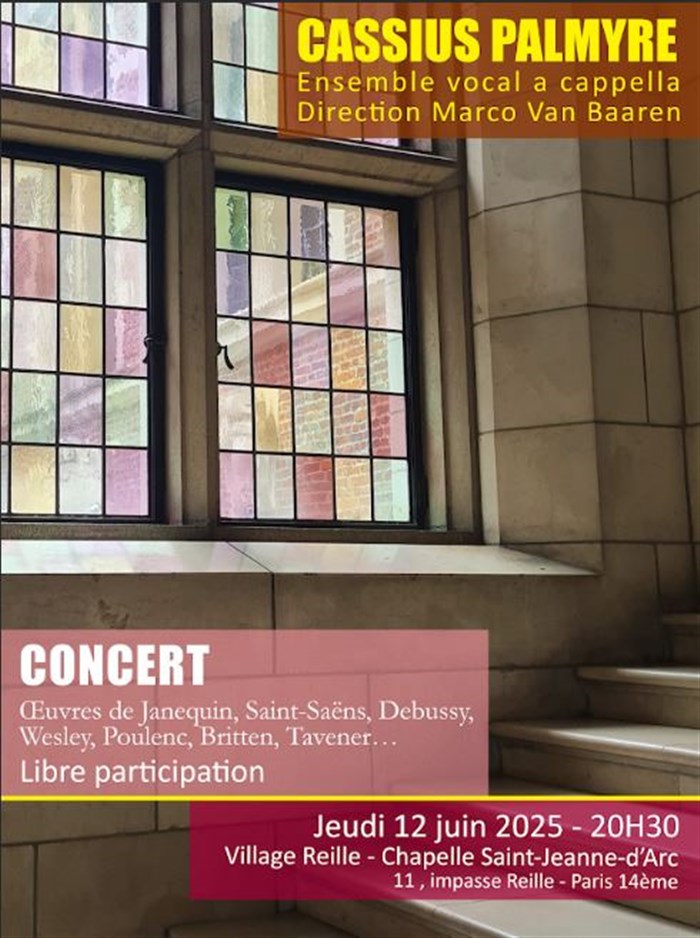 L'ensemble vocal Cassius Palmyre vous présente un programme traversant près de cinq siècles de musique vocale a cappella et met en lumière quelques grands compositeurs français. Qu'écoutait-on dans la France de François Ier, avant l'avènement du cinéma et jusqu'à l'entre-deux-guerres ?