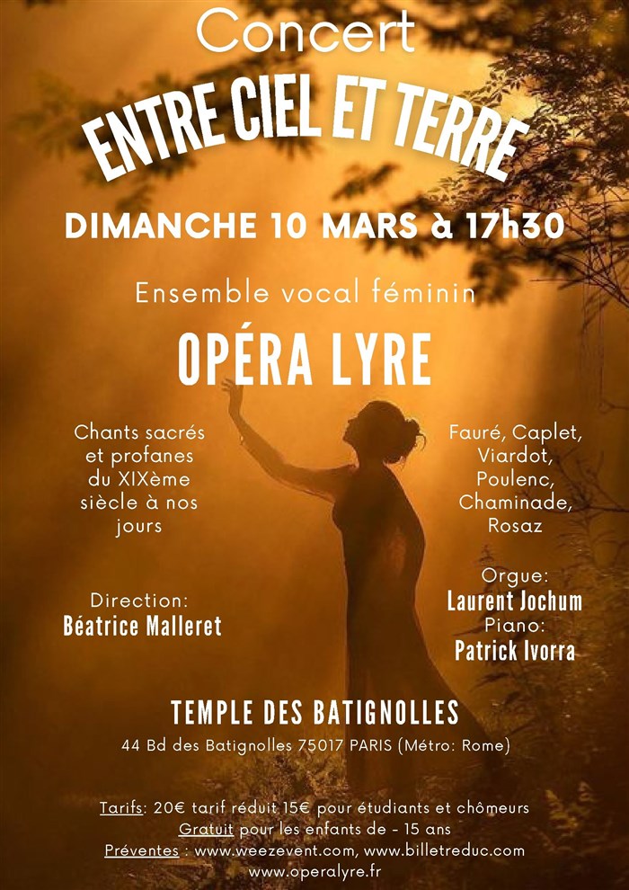 L'ensemble vocal féminin Opéra Lyre vous invite à son concert de printemps aux Batignolles sous la direction de Béatrice Malleret avec Laurent Jochum à l'orgue et Patrick Ivorra au piano.