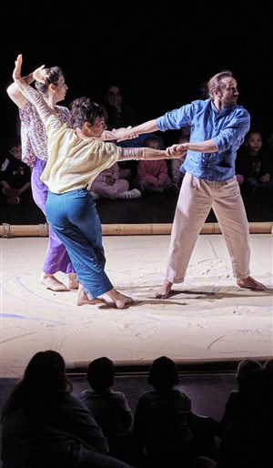 Installé d'un côté et de l'autre de la scène, le public observe au sol des traits, des empreintes, des sillons qui se tracent sur le sable, tandis qu'en haut, un ciel en toile reflète la lumière. Les acrobates grimpent, naviguent, sur une structure en bambou qui devient comme par magie un bateau, une cabane, un archipel.