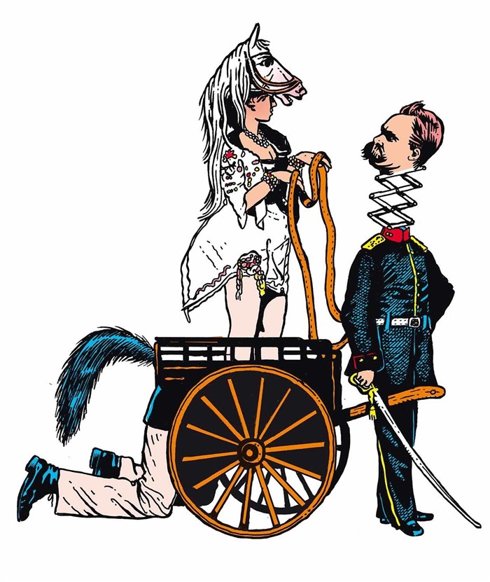 La folie s'empare d'un homme et le monde entier vacille. La paranoïa d'Ervart explose dans sa société d'aristocrates. La région et le pays tremblent, ondes de choc jusqu'au plateau de théâtre où tout dérape. Ervart se croit cocu, il en souffre et en jouit. Il rue dans les brancards d'un pays trop tranquille, il en fracasse tous les tabous. Son délire prend vie sur scène, et avec lui sa femme, ses amants, vrais ou faux. Un précepteur zoophile, agent des services secrets, tombe amoureux d'un cheval de Troie. Le majordome du domaine familial sauve les apparences autant qu'il peut et une comédienne cherche un rôle quand une troupe anglaise traverse le plateau parce qu'elle s'est trompée de pièce. Avec Ervart ou les derniers jours de Frédéric Nietzsche, Hervé Blutsch, auteur dada contemporain, part en guerre contre la pensée étriquée et les usages policés, et compose un chant d'amour au théâtre.