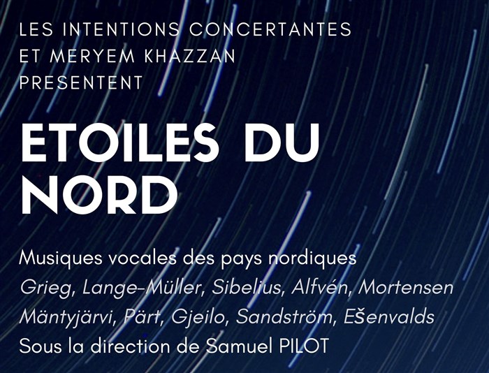 L'ensemble vocal Les Intentions concertantes (direction Samuel Pilot), la soliste soprane Meryem Khazzan et le pianiste Romain Vaille ont la grande joie de vous inviter à découvrir la chatoyante musique vocale des pays nordiques, représentée par une constellation de compositeurs :