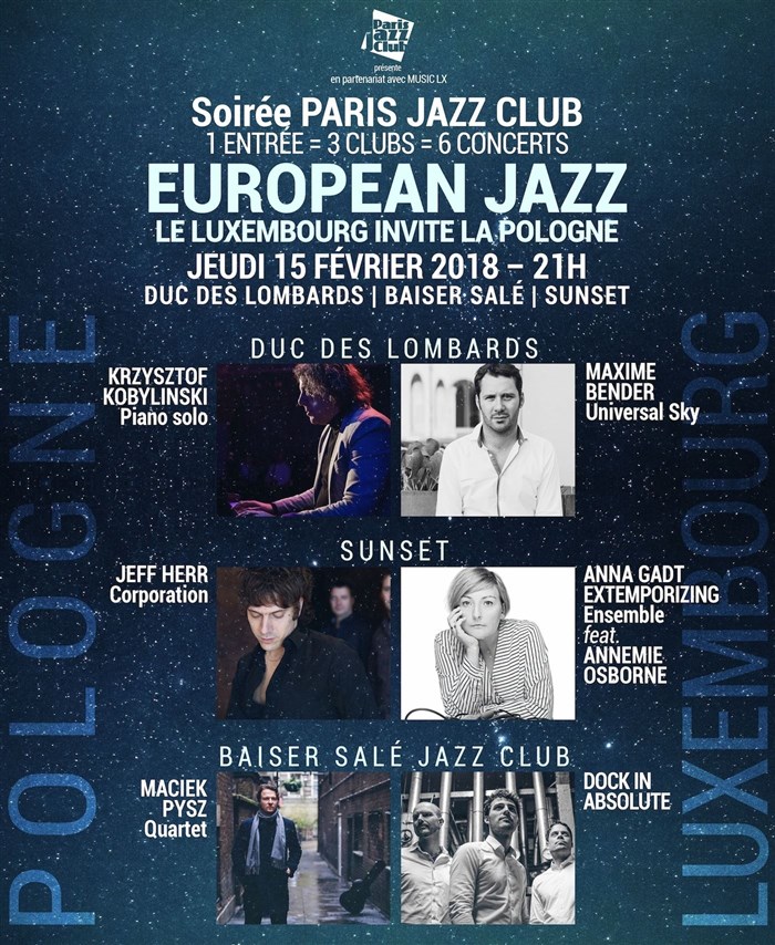 Trois pays d'Europe le temps d'une soirée : lorsque la Pologne et le Luxembourg se retrouvent en musique dans la capitale française. La rue des Lombards est une nouvelle fois plongée au centre d'une rencontre inédite qui promet un séduisant et intriguant mélange entre sonorités de l'est et de l'ouest. Paris Jazz Club, le réseau des lieux de jazz, vous convie à cette soirée d'exception et vous dévoile 6 concerts pour le prix d'une seule entrée !