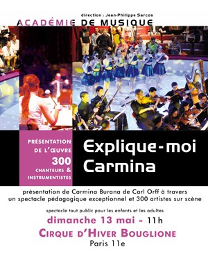 Conçu pour mieux comprendre l'oeuvre, son compositeur, ses voix, " Explique-moi Carmina " vous dévoilera les secrets d'une musique qui s'est imposée au répertoire depuis sa création, il y a près de 70 ans. Plus qu'une simple présentation didactique, ce spectacle vous plongera dans l'univers vibrant de la musique pour choeur et orchestre avec la participation des 300 chanteurs, instrumentistes et solistes du spectacle.