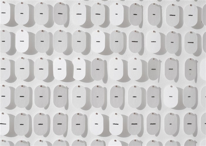 Dans mes oeuvres le mot est tantôt présent en tant que tel tantôt juste suggéré mais toujours investi d'une présence silencieuse ou mieux d'une présence qui s'efforce d'éveiller le silence plutôt que de le combler. Elle considère cette présence comme essentielle pour repenser notre relation avec le mot et approfondir notre expérience de la réalité.