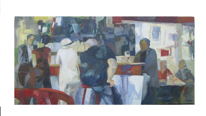 Fascinée par les ambiances des marchés et des bars de la capitale, elle prend plaisir à dessiner sur le vif pour retranscrire ensuite sur toile ces instants de vie dérobés.