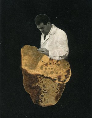 Le titre de l'exposition Les Fusions Secrètes lève le voile sur l'inconnu et l'incertain et joue avec les attributs caractéristiques de la recherche et de l'exploration. Des appareils, comme le microscope, ont la capacité de percevoir et d'approcher ce que notre oeil ne peut voir. Grâce à ces outils, nous pouvons faire la connaissance d'un monde que nous ne voyons pas à l'oeil nu, comme si un univers plein de nouvelles opportunités s'ouvrait devant nous. L'exposition présente une sélection de collages de 2018 autour de la thématique de la connaissance de l'inconnu, de l'indétermination mystique et de l'incertitude des mystères. L'artiste présente des antithèses de la réalité quotidienne, orientée vers des faits et des vérités immuables. Comme le constate Juhaniak : " Les collages sont des confrontations en images, ils reflètent visuellement des phénomènes sociaux et culturels. " Pour créer le contenu de ses collages, l'artiste consigne dans des carnets au cours de ses voyages et de ses visites d'exposition, ses réflexions, des dessins, des idées de combinaisons visuelles ou encore des notes théoriques. L'oscillation entre les différentes techniques d'art et d'expression est caractéristique de l'oeuvre de Juhaniak. Souvent, il travaille sur l'indétermination : il crée des indices et offre au spectateur une expérience contemplative. Les collages minimalistes en noir et blanc font surgir d'un fond sombre des objets non-identifiables, qui matérialisent le jeu formel du collage. Ces objets accentuent le contraste, matériel et technique, et nous y trouvons tant l'harmonie que la dissonance. La forme fait ainsi le jeu du contenu – derrière des objets non-identifiables se cachent des histoires non terminées, ancrées dans le passé, mais qui se confrontent au présent. L'expression artistique s'entremêle naturellement avec l'intérêt de l'artiste pour la philosophie, la mystique, l'astrologie, les sciences et l'histoire. Pour lui, le collage devient le lieu où il peut explorer l'infini des possibles.