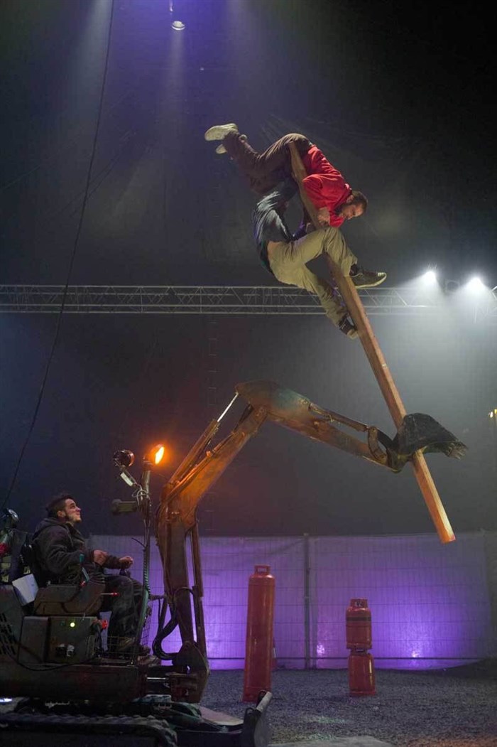 En effet, ce coupci Rémi Lecocq troque son fauteuil roulant contre un engin de chantier. Au commande de la machine infernale, il compte bien avoir le dessus sur ses compères. Véritable exosquelette, elle devient vite le prolongement de luimême lui conférant une force ainsi qu'une précision incomparables ! Rira bien qui rira le dernier. Un spectacle bluffant qui met le public en transe. Une compagnie que ne se prive d'aucun extrême avec folie, générosité et beaucoup, beaucoup d'humour. Décoiffant !