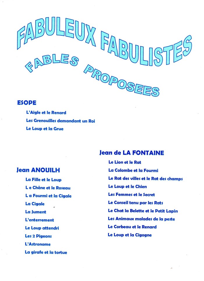 Fables de trois fabulistes : Esope, Jean de La Fontaine et Jean Anouilh interprétées sous forme de récites ou de scénettes dialoguées et animées.