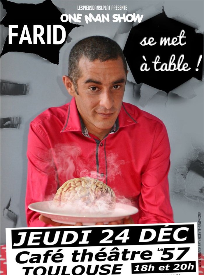Farid se met à table et il y en aura pour tout les goûts ! Un show qui a pour thème la folie humaine, composé d'une galerie de personnage déjantés et de situations totalement absurdes. Et pour le dessert en fin de spectacle ? On vous laisse la surprise... A déguster sans modération !