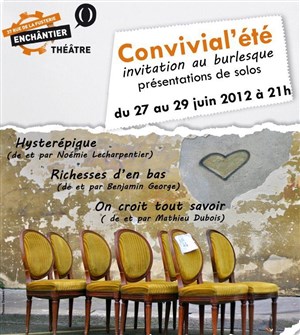 La compagnie Enchântier Théâtre et deux autres compagnies professionnelles (Dé-Mezure's Théâtre et Akasha Studio Théâtre), vous proposent de venir découvrir trois spectacles solos travaillés tout au long de l'année. Chaque spectacle sera accompagné d'un apéritif.
