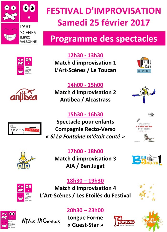 L'Art-Scènes, Association d'Improvisation de Valbonne, vous invite à assister à son 2ème Festival qui se déroulera à la salle du Pré des Arts.