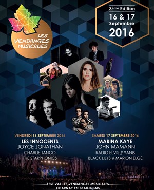 Le festival " Les Vendanges Musicales ", après avoir accueilli plus de 3 000 personnes lors de ses deux premières éditions et des artistes tels que Murray Head, Michael Jones, Fréro Delavega, Emji... est fier d'annoncer sa 3ème édition qui aura lieu les 16 et 17 septembre 2016. La place du Château va vibrer pendant 2 jours au son d'une dizaine d'artistes internationaux qui offriront un spectacle à coupler le souffle.