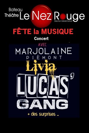 Le Bateau Théâtre - Le Nez Rouge fête la musique en vous proposant un concert réunissant sur la même scène un plateau exceptionnel d'artistes émergents : Marjolaine Piémont, LiviaMusique, Lucas' Gang et quelques surprises...