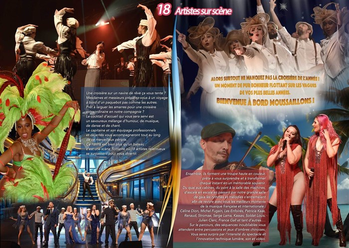 Ce navire est bien plus qu'un bateau : c'est une scène flottante où 18 artistes talentueux se surpassent pour vous divertir. Ensemble, ils forment une troupe haute en couleur, prête à vous surprendre et à transformer chaque instant en un mémorable souvenir. Du quai aux cabines, du pont à la salle des machines, d'escale en escale en passant par notre grande salle de gala les rythmes et mélodies s'entremêlent afin de revivre avec vous les meilleurs moments de la musique française et internationale : Céline Dion, Michel Fugain, Les Enfoirés, Patricia Kaas, Renaud, Stromae, Serge Lama, Kassav, Soldat Louis, Julien Clerc, France Gall et tant d'autres....