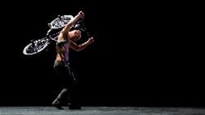 Dans cette confrontation dansée, le vélo prolonge le geste de l'interprète jusqu'à se confondre avec lui.