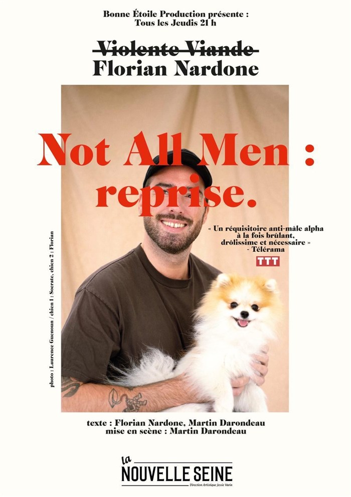 Voici maintenant Florian Nardone de son vrai nom, avec son tout premier spectacle, Not All Men, il y prolonge ses réflexions sur le sexe, les relations amoureuses, nos comportements de citoyens... Autour d'une question centrale pour lui : Qu'est-ce que ça veut dire, être un homme de nos jours ? Et comment se construire en tant qu'homme lorsqu'on n'a eu que des modèles féminins autour de soi ?