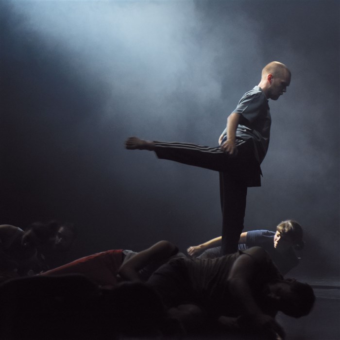 Huit danseurs et six projecteurs automatiques tracent leurs trajectoires parallèles, ils sont partenaires rayonnants d'une respiration commune.