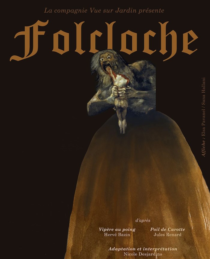 Je pense aussi à la Reine de la Nuit dans l'Opéra de Mozart "La Flûte enchantée". Quelle est cette femme qui s'oppose à la lumière royale du père ? La nuit, la lune, une féminité en creux, coupable, incomprise. Une féministe avant l'heure, s'enferrant dans sa haine et son agressivité. Sans chercher à réhabiliter qui que ce soit, je souhaite cependant que mon spectacle "Folcloche" soulève ce genre de questions. Peut-être, les spectateurs, porteront-ils, sans aller jusqu'à les excuser, un regard plus tempéré sur les monstres qu'engendre le manque d'amour. Méchamment drôle et drôlement méchante, Folcloche est un grand clown tragique..."