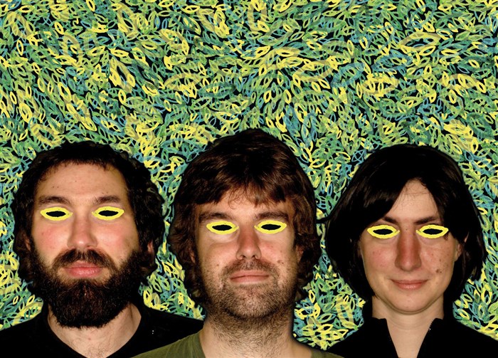 Deux batteurs et une fille qui a appris à jouer du clavier en collant des gommettes de couleur sur les touches.
