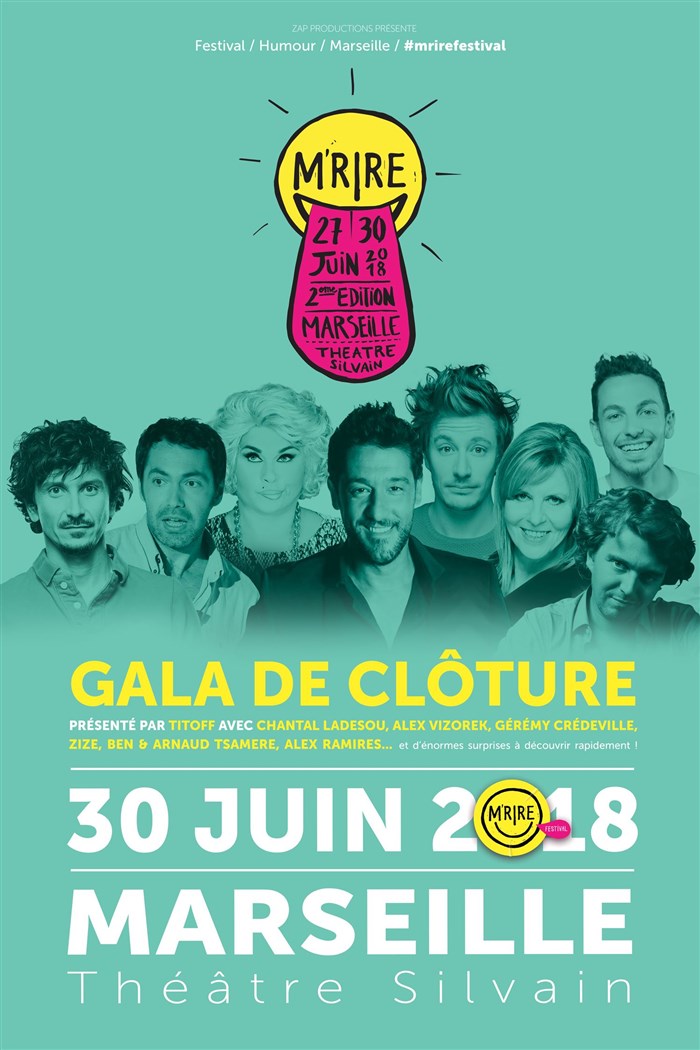 Gala de clôture présenté par Titoff, avec des artistes plus drôles les uns que les autres, stars de la scène nationale ou génération montante: Chantal Ladesou et sa décontraction légendaire, Ben et Arnaud Tsamère qui nous feront en exclu un extrait de leur nouveau spectacle, Alex Vizorek le flamboyant, mettra son érudition à la portée de tous, Zize du Panier nous parlera du mariage épique de son fils, Alex Ramires sera sensiblement viril , Gérémy Crédeville est comme le dit le titre de son spectacle parfait... Enfin presque ! Et bien d'autres.