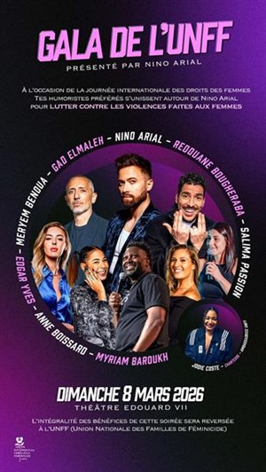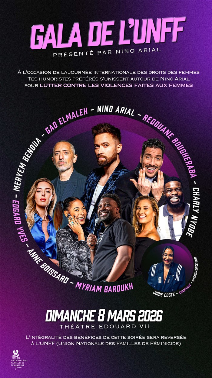 Le 8 mars, Journée internationale des droits des femmes, Nino Arial et tes humoristes préférés montent sur scène pour faire entendre une voix commune contre les violences faites aux femmes. Une soirée solidaire dont l'intégralité des recettes est reversée à l'UNFF, Union Nationale des Familles de Féminicides.