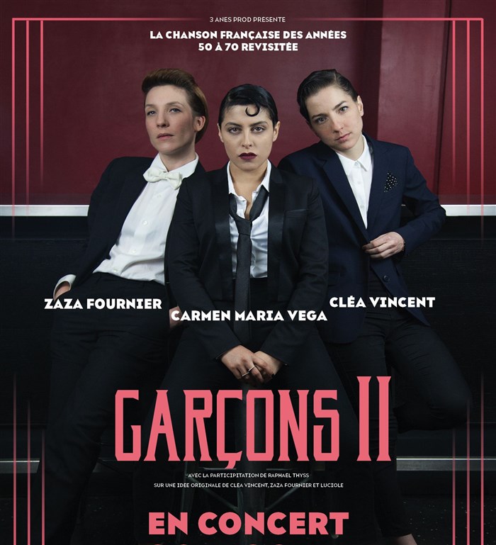 Garçons II est le deuxième épisode d'un spectacle qui s'est joué avec succès aux Trois Baudets durant tout le mois de juillet 2014 avec Zaza Fournier, Luciole et Cléa Vincent.