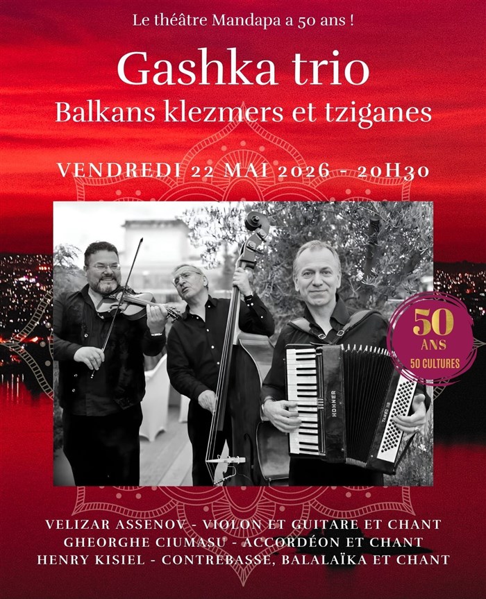 Découvre Gashka trio - Balkans klezmers et tziganes, qui fait partie de notre sélection d’événements de type Musique du monde et qui se tient ici : Centre Mandapa -