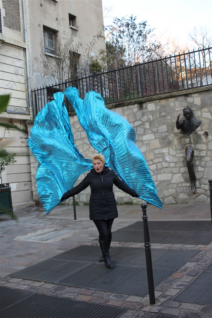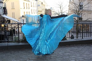 De son costume constitué d'une cape bleue, rouge ou dorée, l'artiste réalise la fameuse danse serpentine de Loie Fuller et déploie ses ailes comme une invitation à chacun de déployer les siennes.