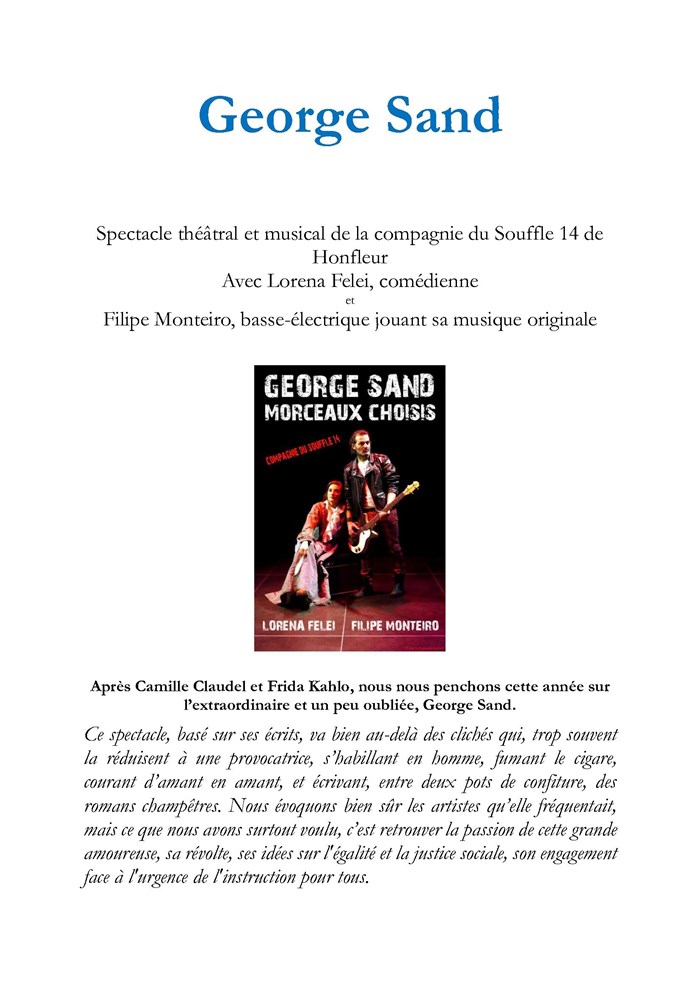 Ce spectacle, basé sur ses écrits, va bien au-delà des clichés qui, trop souvent la réduisent à une provocatrice, s'habillant en homme, fumant le cigare, courant d'amant en amant, et écrivant, entre deux pots de confiture, des romans champêtres. Nous évoquons bien sûr les artistes qu'elle fréquentait, mais ce qu'ils ont surtout voulu, c'est retrouver la passion de cette grande amoureuse, sa révolte, ses idées sur l'égalité et la justice sociale, son engagement face à l'urgence de l'instruction pour tous.