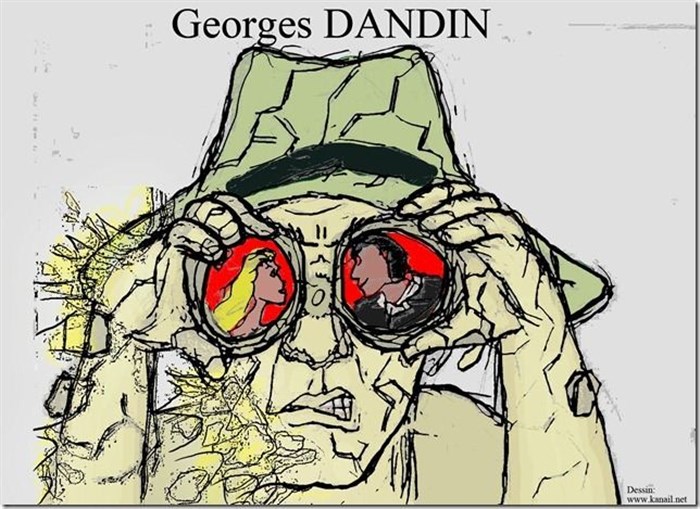 Dandin se croit cocu et veut confondre sa femme. Ses manoeuvres se retournent contre lui. Humiliations et grincements de dents. Rires des autres et jusqu'au drame qui guette au bout de la nuit...