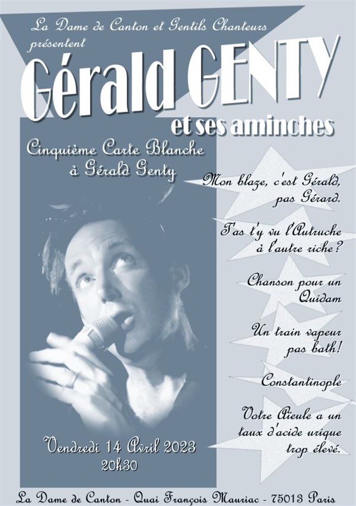 Quelques semaines après la sortie de son excellent septième album, Marchons sur Mars, le merveilleux Gérald Genty sera de retour sur la mythique scène de la fabuleuse Dame de Canton pour la cinquième des légendaires Cartes blanche à Gérald Genty (le fameux chanteur).