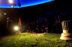 Un chapiteau jaune au toit comme un parapluie. A l'intérieur, de la pelouse, une arène de verdure. Sur le talus, un homme seul en scène nous raconte l'histoire de Bérénice, Titus et Antiochus, trois jeunes qui vivent leur premier amour dans un monde bien trop lourd pour eux.