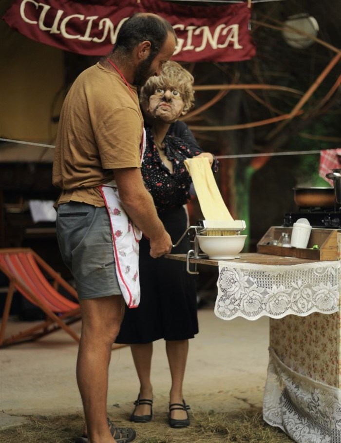 Perchée sur ses talonnettes, Gina apostrophe les spectateur.ice.s, choisit quelques commis, fait valser les ingrédients, téléphone à ses copines italiennes tout en dirigeant de main de maître ses aides- cuisiniers.