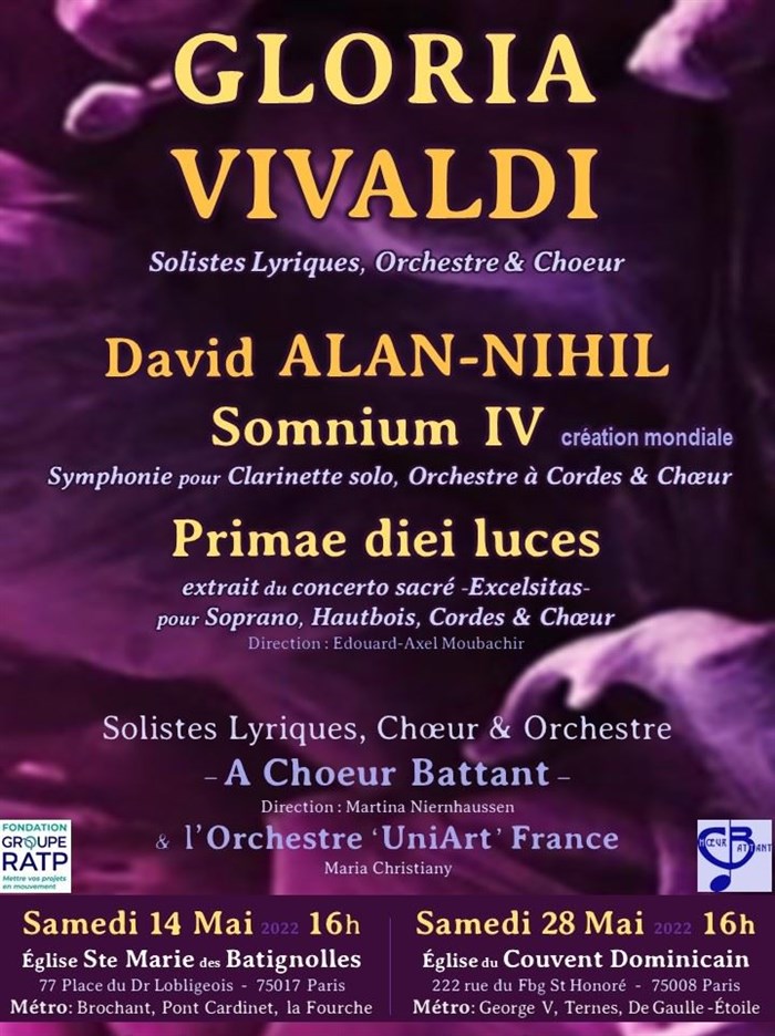 L’événement Gloria de Vivaldi et Oeuvres de David Alan-Nihil : version lyrique avec orchestre, choeur et solistes de type Musique Sacrée, organisé ici :