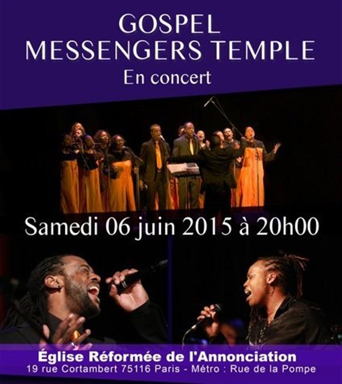 Retrouvez Gospel Messengers Temple avec leurs musiciens (Bernard Angerville, Alix Davin, Joel Dufeu et Gwennael Dorville) pour un concert exceptionnel le Samedi 6 juin 2015 à 20h00 à l'Église Réformée de l'Annonciation Paris 16ème (superbe lieu de 400 places).
