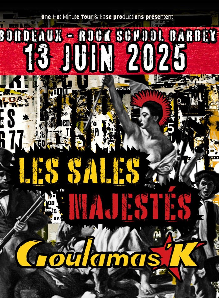 Les Sales Majestés, icônes du punk rock français, vous donnent rendez-vous pour un concert qui promet de faire trembler les murs de la Rock School Barbey. Ils partageront la scène avec Goulamas'k, groupe emblématique à l'énergie débordante et aux sonorités puissantes. Une soirée électrique et engagée à ne pas manquer !