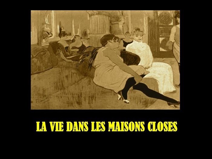 Elles s'appelaient Niniche la Boulotte, Pattes d'Araignée, la Môme Sucre d'Orges, la Grande Berthe... Toutes ces anonymes seront ravivée lors d'un goûter-conférence, dans une ancienne maison-close, afin de retrouver l'intimité de ces lieux de plaisirs cachés aux yeux indiscrets. A la manière du peintre Toulouse-Lautrec c'est la vie quotidienne des filles de maison qui intéressera.